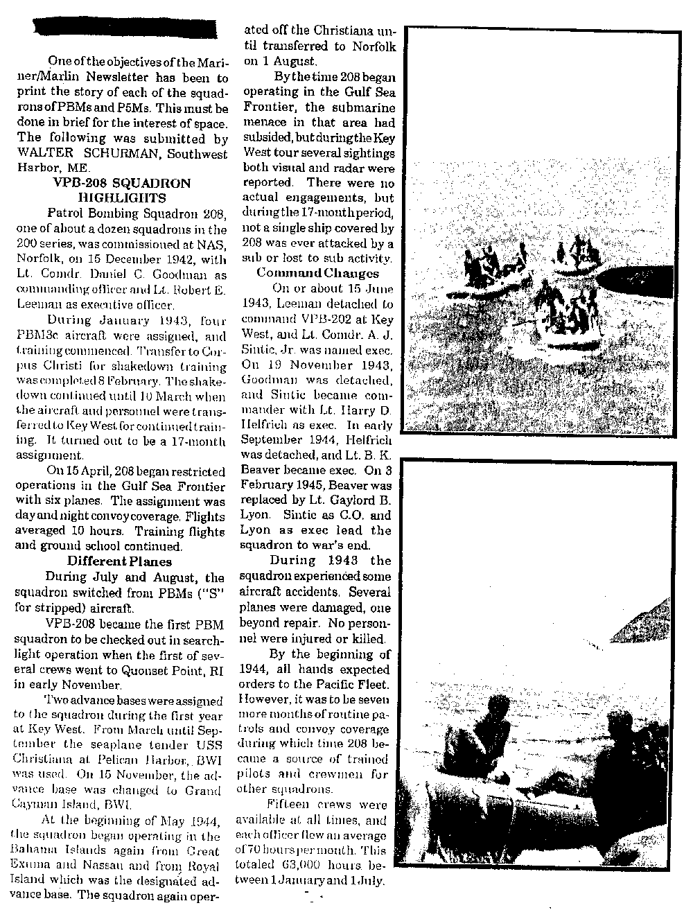 A BIT OF HISTORY:  "...History of VPB-208 - One of the objectives of the Mariner/Marlin Newsletter has been to print the story of each of the squadrons of PBMs and P5Ms.  This msut be doen in brief for the interest of space.  The following was submitted by Walter Schurman, Southwest Harbor, ME..." Contributed by DAUM, F. David (Deceased) and forwarded by Drake A. Daum Drake.Daum@wpafb.af.mil [03MAR2005]