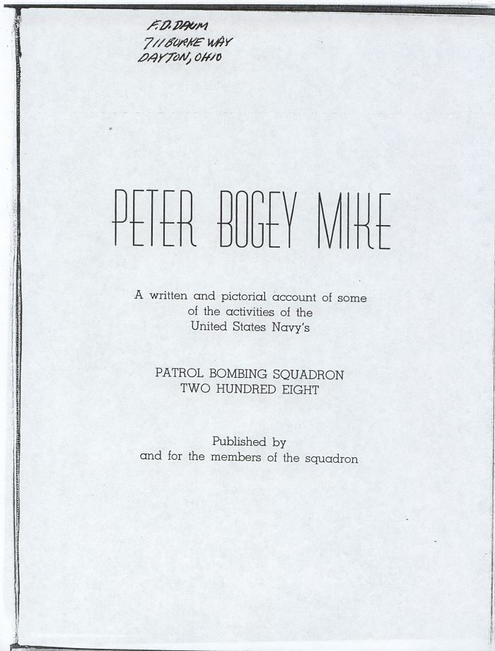 A BIT OF HISTORY:  "...VPB-208 CruiseBook Circa 1945.  Note: Crew Photo's from the Cruisebook were previously submitted by another Shipmate and posted on VPB-208's Crew Summary Page.   It should be noted that the normal phonetic alphabet for PBM would have been Peter Baker Mike.  However, several PBM aircraft Dad's squadron were notorious for frequent communications problems.  Hence, these birds were often mistaken for enemy aircraft (bogeys) until properly identified.  The squadron decided to comically name their book in honor of this continuing snafu.  Thus, BOGEY was used for the "B" in PBM, instead of Baker..." Contributed by DAUM, F. David (Deceased) and forwarded by Drake A. Daum Drake.Daum@wpafb.af.mil [03MAR2005]