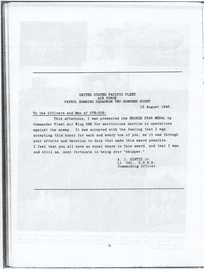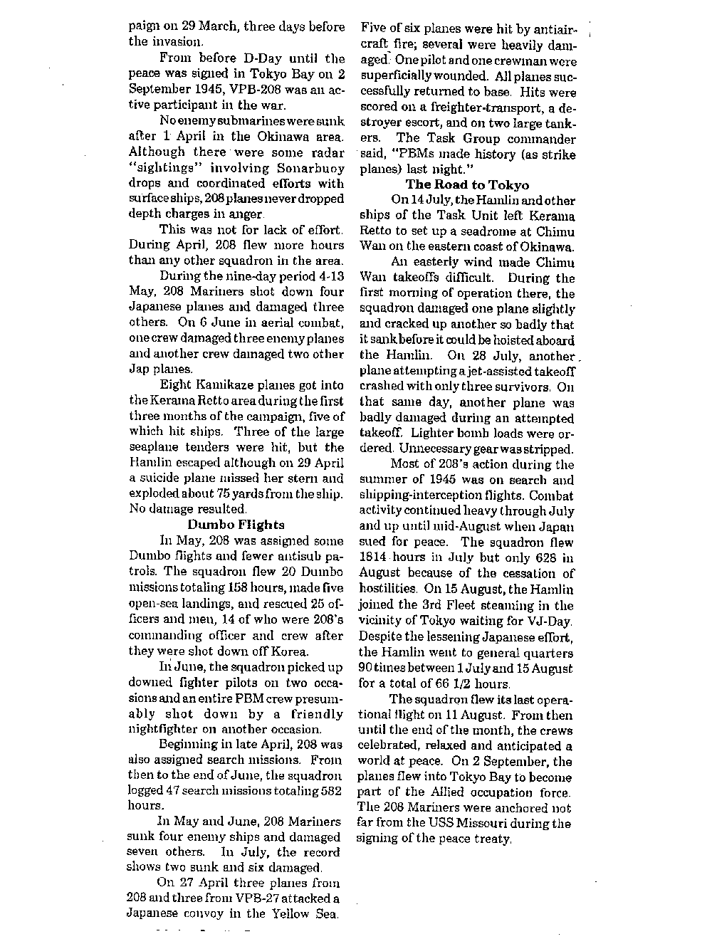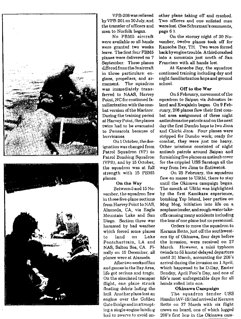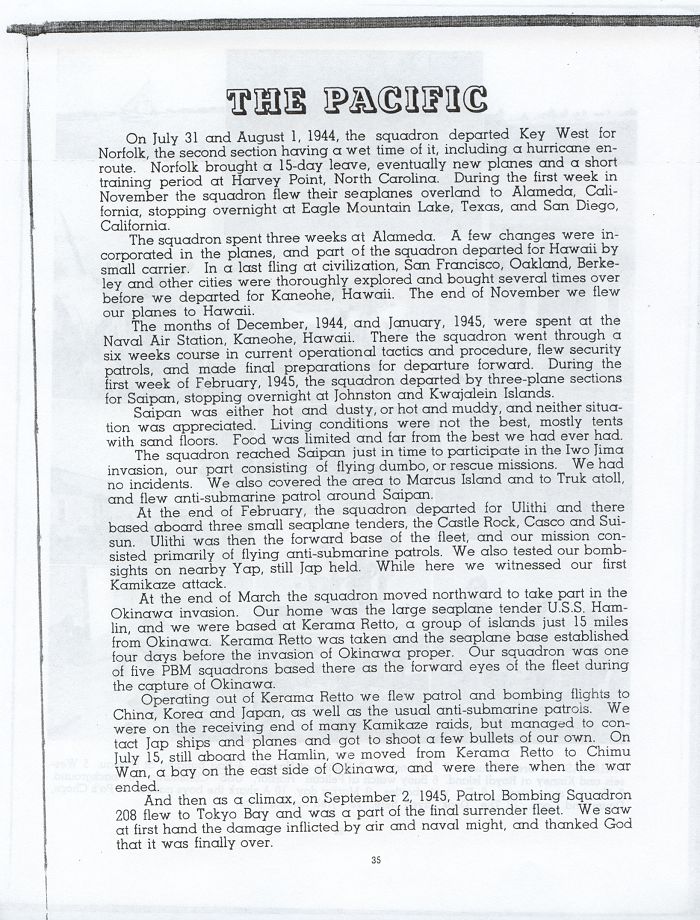 This has been a condensed version of the exploits of Patrol Bombing Squadron-208, this also happens to be the title of a book that was written by one of 208's crew members who gives a more precise and detailed version of 208's exploits. If you are interested in one of his books his name is: Walter Schurman, 2400 S. Ocean Dr. #6124, Ft.Pierce, Fl. 34949