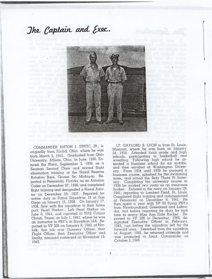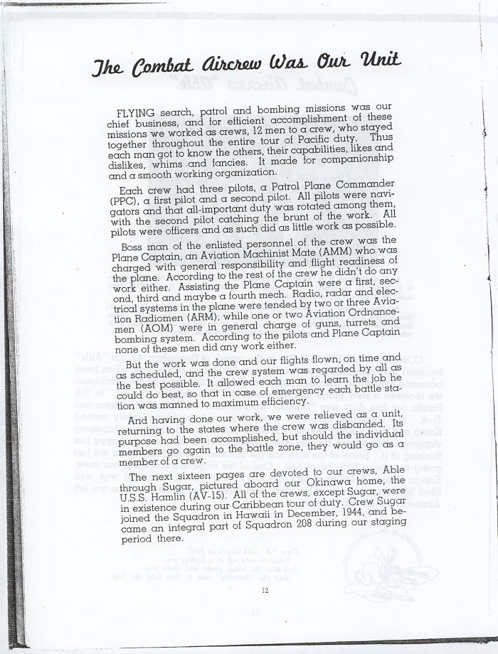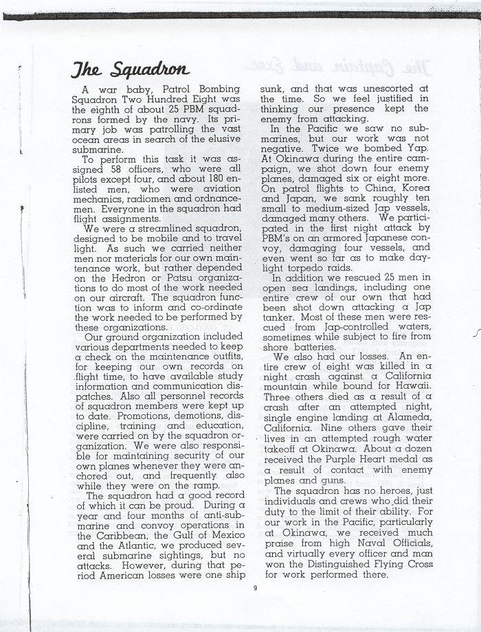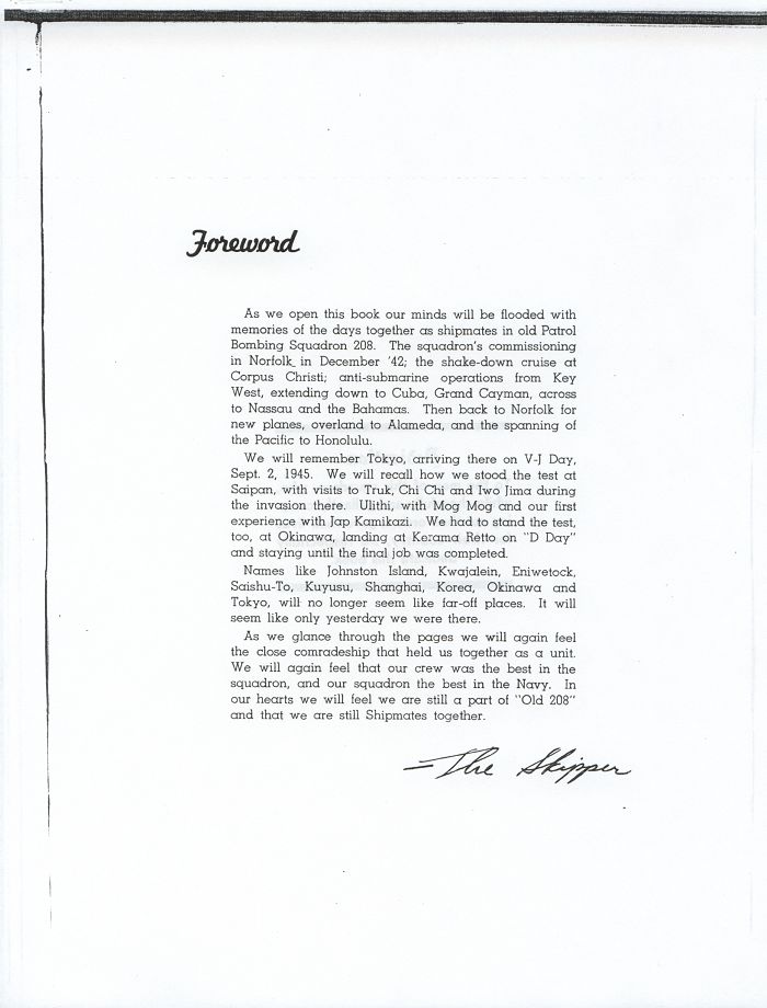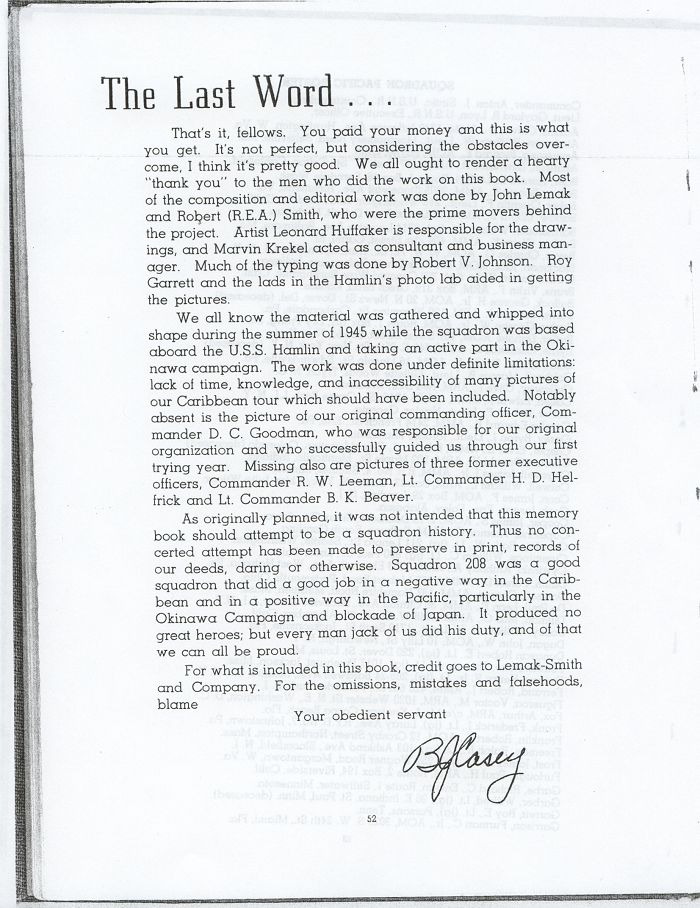 As originally planned, it was not intended that this memory book should attempt to be a squadron history. Thus no concerted attempt has been made to preserve in print, records of our deeds, daring or otherwise. Squadron 208 was a good squadron that did a good job in a negative way in the Caribbean and in a positive way in the Pacific, particularly in the Okinawa Campaign and blockade of Japan. It produced no great heroes; but every man jack of us did his duty, and of that we can all be proud.