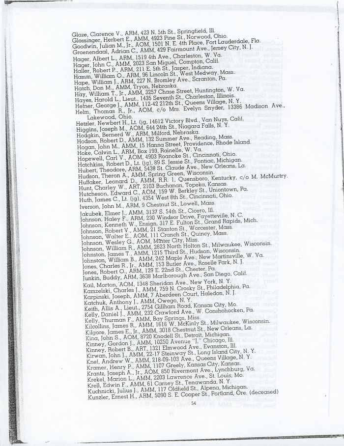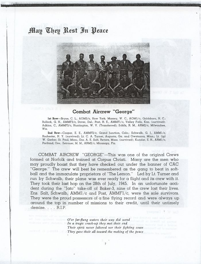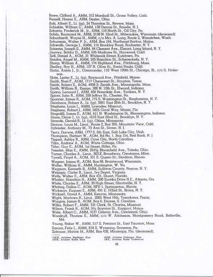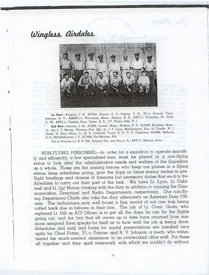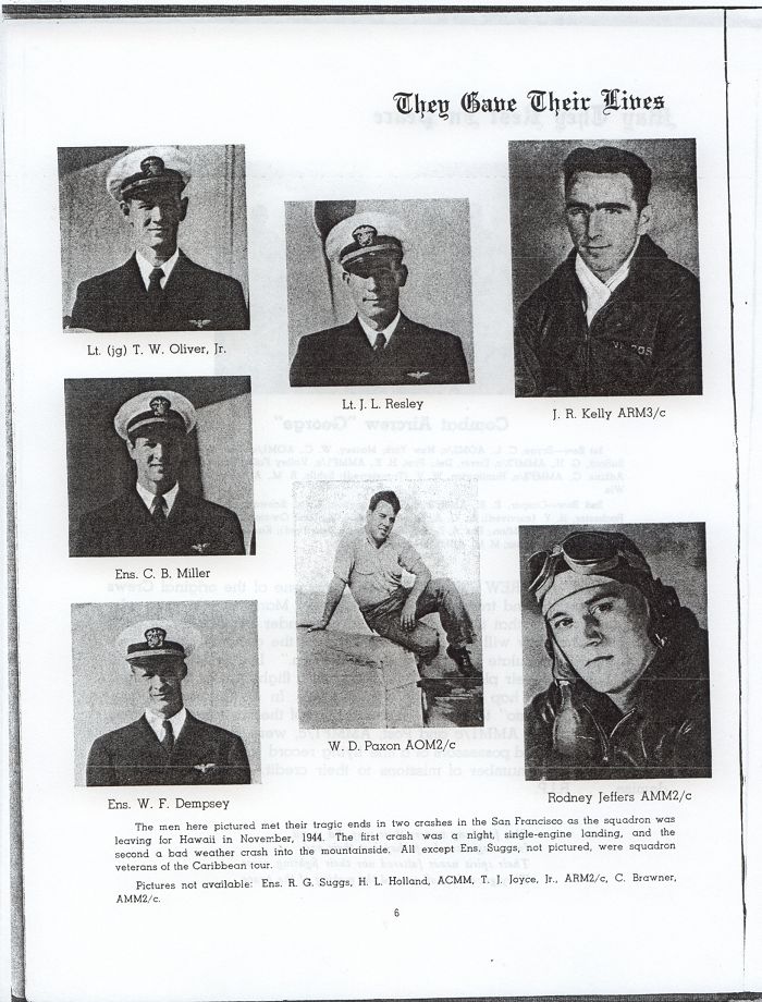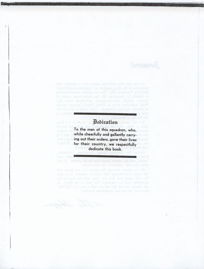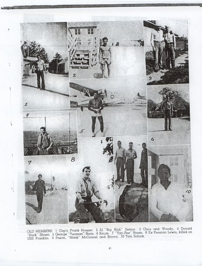 We all know the material was gathered and whipped into shape during the summer of 1945 while the squadron was based aboard the USS Hamlin (AV-15) and taking an active part in the Okinawa campaign. The work was done under definite limitations: lack of time, knowledge, and inaccessibility of many pictures of our Caribbean tour which should have been included. Notably absent is the picture of our original commanding officer, Commander D. C. Goodman, who was responsible for our original organization and who successfully guided us through our first trying year. Missing also are pictures of three former executive officers, Commander R. W. Leeman, Lt. Commander H. D. Helfrick and Lt. Commander B. K. Beaver.