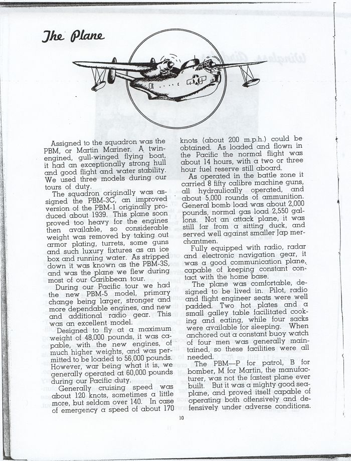The squadron originally was assigned the PBM-3C, an improved version of the PBM-l originally produced about 1939. This plane soon proved too heavy for the engines then available, so considerable weight was removed by taking out armor plating, turrets, some guns and such luxury fixtures as an ice box and running water. As stripped down it was known as the PBM-3S, and was the plane we flew during most of our Caribbean tour.