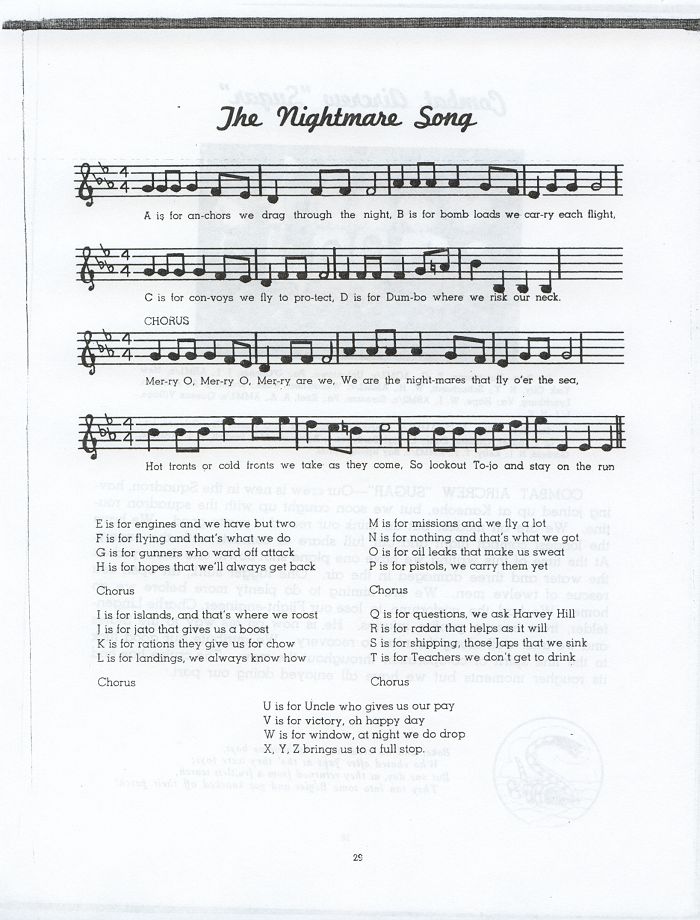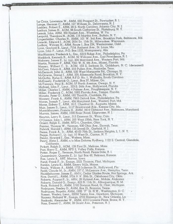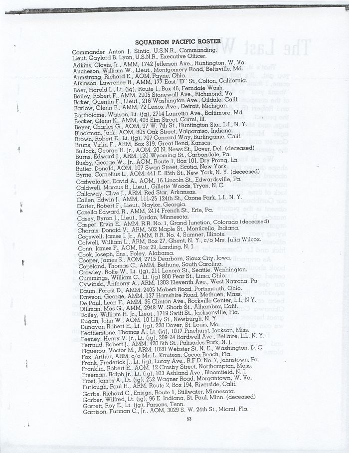 We also had our losses. An entire crew of eight was killed in a night crash against a California mountain while bound for Hawaii. Three others died as a result of a crash after an attempted night, single engine landing at Alameda, California. Nine others gave their lives in an attempted rough water takeoff at Okinawa. About a dozen received the Purple Heart medal as a result of contact with enemy planes and guns. The squadron has no heroes, just individuals and crews who did their duty to the limit of their ability. For our work in the Pacific, particularly at Okinawa, we received much praise from high Naval Officials, and virtually every officer and man won the Distinguished Flying Cross for work performed there.