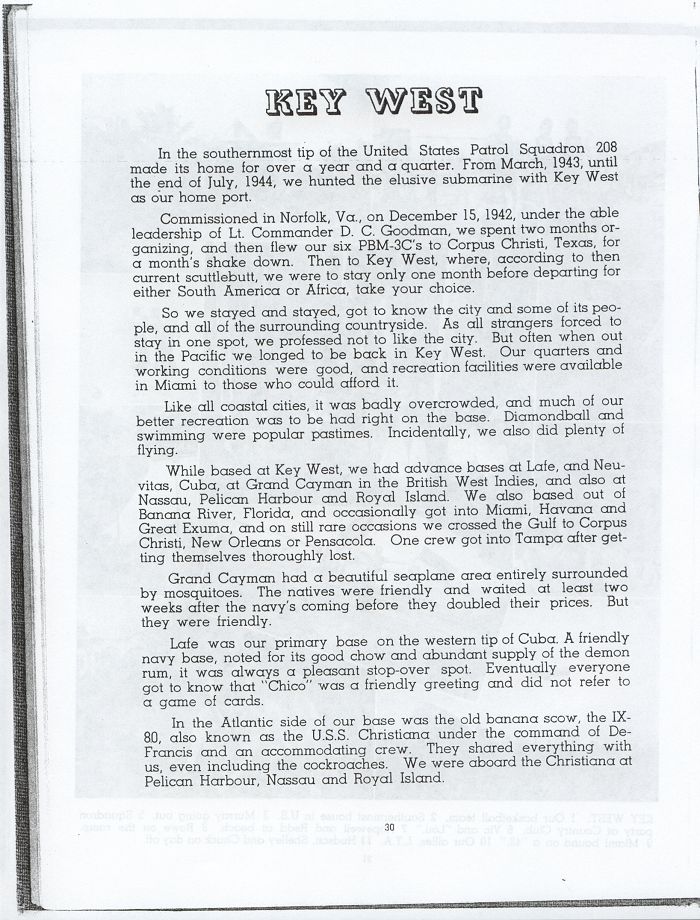 On the 15th of December 1942, at the Naval Air Station,in Norfolk,Va. Patrol Squadron 208 was born with appropriate ceremonies. The compliment at the time consisted of 21 Officers and 83 enlisted men. The personnel were divided into 18 combat air crews (CAC) and some non-flying personnel, but there were no aircraft assigned. By the 6th of Feb. the squadron had received 5 Martin Mariners PBM3c. and an increase in officers and enlisted men The squadron was then assigned to Corpus Christi,Texas for shakedown training. After a very extensive couple of months of training, the squadron was then assigned to Key West Naval Air Station as home port in the early part of June 1943.I joined the squadron in the early part of August, '43 from Transitional Training Squadron Atlantic, stationed at Banana River, Fl.  While in Key West we flew anti-sub patrols day and night,in the Gulf of Mexico,Atlantic and Caribbean. We also operated out of advanced bases,Grand Cayman Island, (BWI) Cuba, Great Exuma and Nassau in the Bahamas. In January of 1944 the squadron was anticipating an assignment and transfer to the Pacific theater of operations, it did'nt happen. We figured we were going to spend the rest of war in Key West,