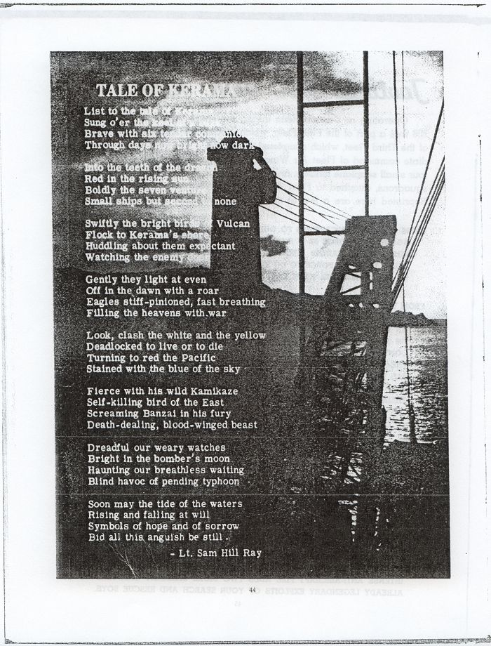 On the 1st of April the squadron left Ulithi for Kerama Retto which is a small group of islands off the southern end of Okinawa. This was the same day the invasion of Okinawa started. When we arrived at Kerama Retto we hooked up with the seaplane tender USS Hamlin which was to be our home for the remainder of the campaign. The day after we arrived at Kerama Retto some of our planes were out on day and night patrols. There were many instances were our planes encountered Japanese aircraft and in some of these encounters we chased and shot down or left their planes trailing smoke. Most of the Japanese planes were on Kamikaze missions to dive bomb the ships at Okinawa and they would not be deterred from that mission, so we rarely received any return fire from them. In one instance the ships at Okinawa did not pick up on their  radar,a flight of eight Jap Kamikaze that were headed for Okinawa. Our pilot radioed ahead that the planes were on the way and the ships gunners were waiting for them with guns ablazin. Our crews also encountered Jap merchant ships which were attacked with bombs and strafed, some of which were sunk and others heavily damaged.