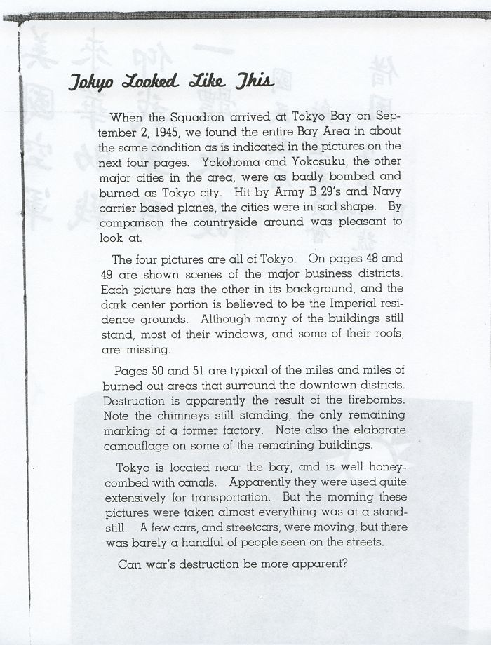 In August of 1945 2 Atomic bombs were dropped on the cities of Hiroshima and Nagasaki which pretty much ended the war. On the 2nd of Sept. as the peace treaty was being signed VPB-208 flew into Tokyo Bay from Okinawa. The war was over for us