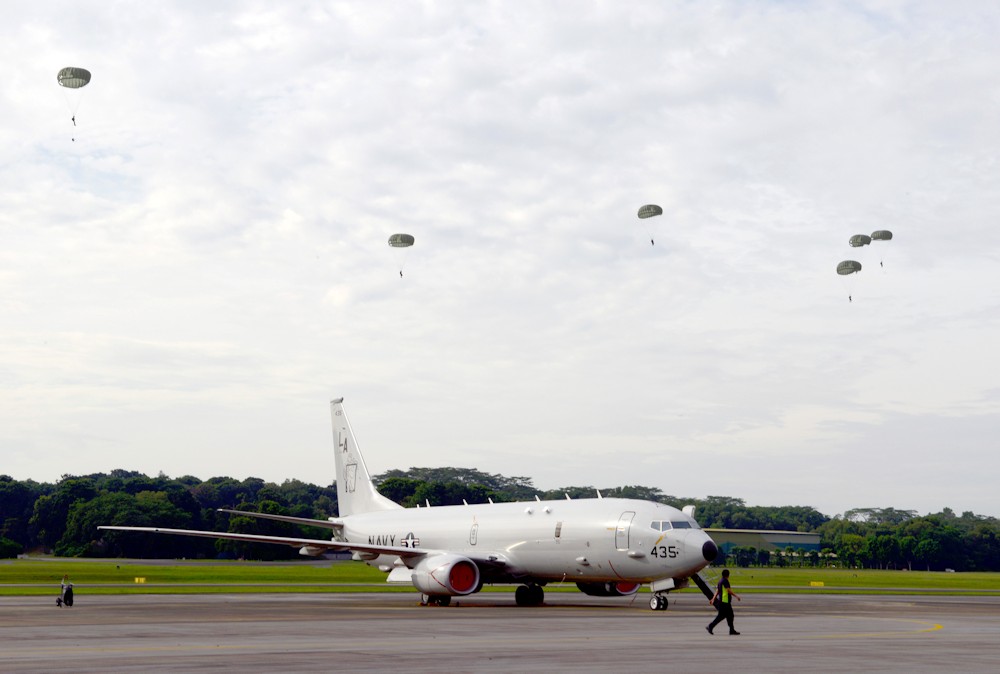 AIRCRAFT:  VP-5 P-8 BUNO: 168435 "...PAYA LEBAR, Singapore (Aug. 1, 2014) Republic of Singapore paratroopers conduct training above a P-8A Poseidon assigned to the Mad Foxes of Maritime Patrol Squadron (VP) 5 during Cooperation Afloat Readiness and Training (CARAT) Singapore 2014. In its 20th year, CARAT is an annual, bilateral exercise series with the U.S. Navy, U.S. Marine Corps and the armed forces of nine partner nations including, Bangladesh, Brunei, Cambodia, Indonesia, Malaysia, the Philippines, Singapore, Thailand and Timor-Leste. (U.S. Navy photo by Mass Communication Specialist 1st Class Jay C. Pugh/Released)..." WebSite: NAVY.MIL http://www.navy.mil/ [09AUG2014]