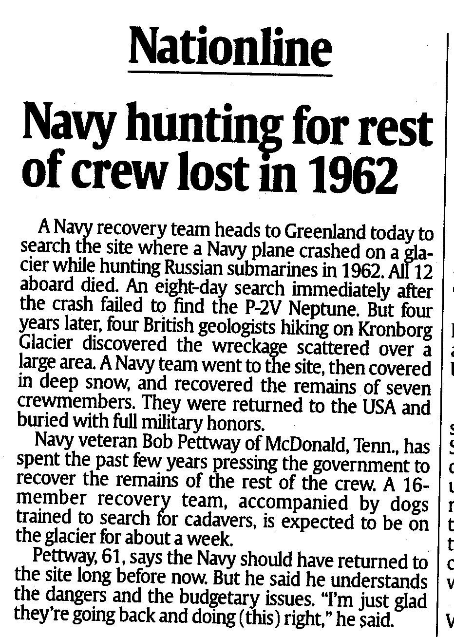 "...Navy Marine Corps News - 8/28/2004 - 1962 Plane Crash Recovery - A U.S. Navy Recovery Team Returned To Norfolk Last Week After Recovering Remains And Personal Effects From The Site Of A U.S. Navy Plane Crash On The Kronborg Glacier In Greenland In 1962..." VIDEO http://www.news.navy.mil/management/videodb/player/video.aspx?id=3218 [28AUG2004]